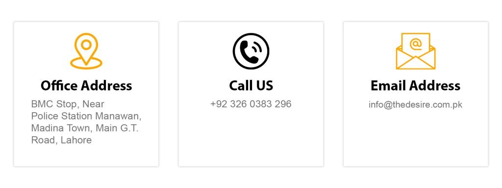 Get In Touch Meet Us BMC Stop, Near Police Station Manawan, Madina Town, Main G.T. Road, Lahore Call Us +92 326 0383 296 Email Us info@thedesire.com.pk Contact UsHave Questions? We’re Here to Help Notice: JavaScript is required for this content. Address List BMC Stop, Near Police Station Manawan, Madina Town, Main G.T. Road, Lahore +92 326 0383 296 info@thedesire.com.pk Instagram Whatsapp